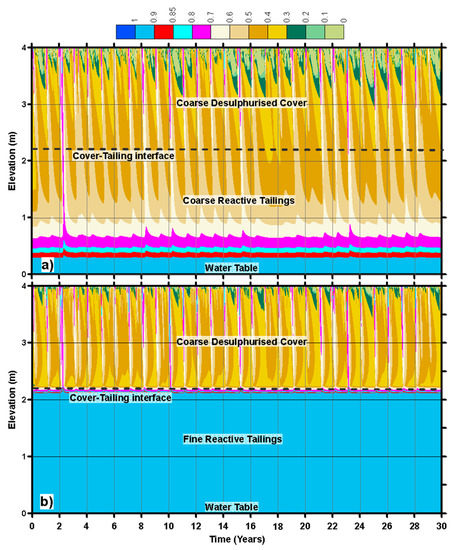 The 30-year cumulative oxygen flux values for the fine cover profiles in Figure 11 indicate considerable differences compared to the coarse cover profiles. For fine cover profiles, the oxygen flux at the tailings–cover interface is negligible. This is not a surprising result, as the presence of fine material in tailings and/or cover is expected to maintain higher levels of saturation resulting in minimal oxygen ingress. Figure 13 shows the saturation time history of the FF and CF profiles for 30 years of base climate. The saturation time history of the FF profile shows that saturation of the fine acid generating tailings never falls below 85%. This is due to the location of the groundwater table depth and high AEV of the tailings. It can also be observed that the cover comprising of the desulfurized fine tailings is also very effective in maintaining higher saturations and the bottom 30 cm of the cover always remains at saturation in excess of 85%. The time history of saturation for the FC profile is also shown in the same figure. It can be observed that for most of the coarse acid generating tailings, the saturation varies from 20% to 60%. However, the cover saturation near the cover tailings interface remains above 85%. There are only a few instances during the 30-year period when saturation at the interface is 70% or slightly lower.