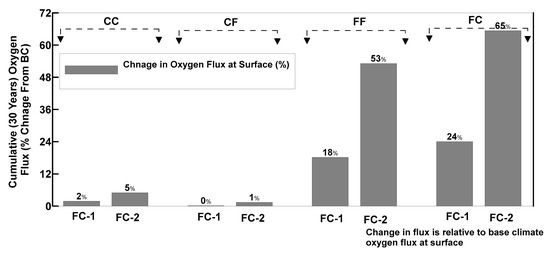Figure 11 and Figure 12 also show the oxygen flux values at the cover surface for fine covers. The flux values increase with changing climate. Larger changes in the 30-year cumulative flux values for FF and FC profiles can be observed for the FC-2 climate ensemble. In relation to the base climate, the flux values for the FF cover profile increase by 18 and 53% for the FC-1 and FC-2 climates, respectively. Similarly, for the FC cover profile the oxygen flux at the cover surface increases by 24% and 65% for the FC-1 and FC-2 climates, respectively. The increase in surface oxygen flux for fine cover profiles is related to the higher effective reactive coefficient () of the fine tailings as compared to the coarse. The value of fine tailings is an order of the magnitude larger than for the coarse tailings material ( for fine 44 year−1 and for coarse is 3.44 year−1). The other reason could be due to the increased evaporative demand because of the changing climate. The fine cover will retain more water in the near surface layer, increasing actual evaporation, resulting in a decrease in cover saturations with increased oxygen ingress at the surface.