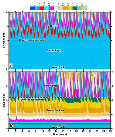 That the coarse tailings cover a considerable amount of oxygen flux at the tailings–cover interface was predicted; however, the results indicate that their performance will not deteriorate with changing climate (Figure 11). Although the year to year variation in the oxygen ingress is expected in the future, the cumulative 30-year oxygen ingress is not much different in the coarse covers for all climates. The effectiveness of the coarse cover generally depends on the underlying tailings. The covers placed over the fine tailings have shown higher saturation along the cover-tailings interface due to high AEV value of the tailing materials.