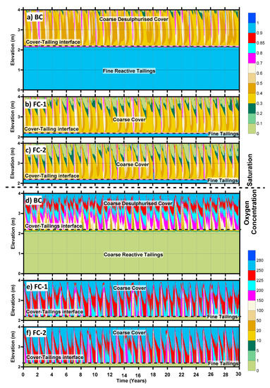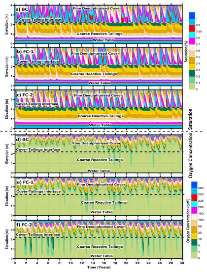 As the saturation over the interface remains 85% in most of the instances, therefore, the oxygen concentration in the tailings is extremely low (Figure 15d–f). However, in the instances when the saturation at the interface is below 85%, oxygen concentrations between 0 and 1 g/m2 can be observed in the tailings for all climates. For FC-1 and FC-2, there are instances when the concentration in the tailings increases to a range between 5 and 10 g/m2. Moreover, there are few years during FC-2 (year 3, 7, and 23) when the concentration goes past this range up to 20 g/m2. This is due to the lower saturation near the interface during this time of the year. Similar to the saturation plots, the oxygen concentration in the upper portion (0 to 0.6 m approximately) is highly variable, falling in the range between 100 and 280 g/m2. Beyond this depth, the oxygen concentration is generally in the range between 5 and 100 g/m2. Overall, the fine cover maintains high saturation during 30-year time period near the interface, which results in the low ingress of oxygen into the tailings in all climates.