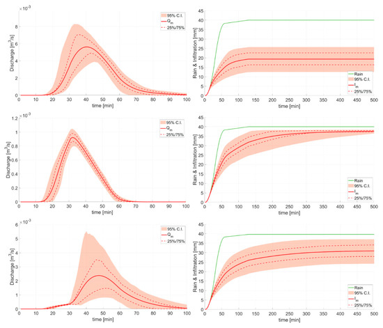Hydrographs and infiltration computed for the Monte Carlo simulations in the PL (first row), HM30 (second row), and PP20 (third row) configurations. Red solid lines are the mean discharge and mean infiltration, respectively. Red dashed lines represent the first and third quartile of the distribution. Red area delineates the 95% confidence interval.