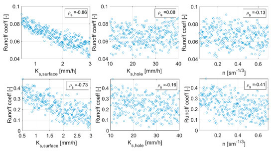 Spearman’s correlation coefficients () between the runoff coefficient and input parameters for each configuration.