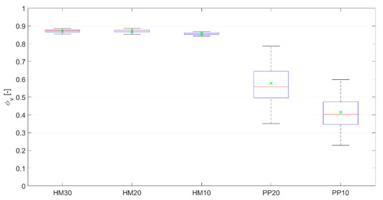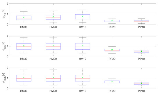 Boxplot of outflow reduction efficiency. In each box, the upper and lower edges indicate the first and third quartile, respectively, the red central line is the median and the green x symbol is the mean. The whiskers length was set equal to the interquartile distance. Outliers have been hidden.