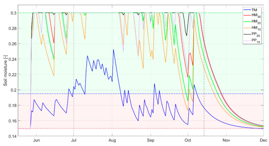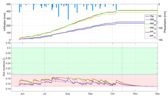 Focusing on the growing period of the analyzed crop, the water stress is stated by a level of soil moisture lower than the threshold. The threshold is defined as the soil moisture at the field capacity multiplied by the depletion factor of the crop [51]. The higher level of soil water content induced by the RWHT indicates that there is an improvement of the hydrological efficiency of the whole system, meaning the farm field. In terms of water stress mitigation (), HM configurations show an efficiency comprised between 20.7% and 23% while PP lead to significantly lower values of 3.75% and 2.85% (Table 6).