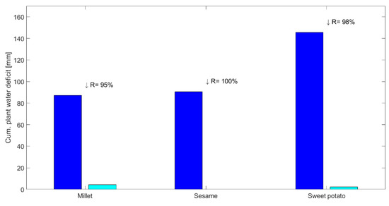 The maximum reduction is obtained for the sesame since no deficit is produced when using HM10. This occurs since the sesame harvesting takes place around mid-September, hence before the end of rainfalls and increase of temperature. Instead, the longer growing season of sweet potato undermines the traditional system leading to a higher PWD. On the contrary, HM10 highlights a great efficiency producing a deficit even lower than for the millet.
