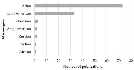 Geographical distribution of publications focusing on irrigation-induced landslides, following the global macroregional classification defined by Andĕl et al. [49] and the scientific literature published in Chinese, English, and Spanish.