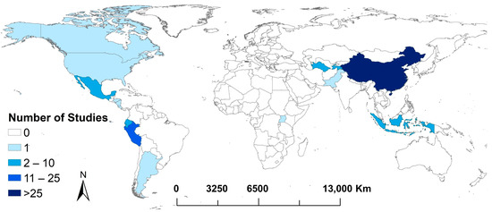 Number of irrigation-induced landslides documented within the Chinese, English, and Spanish literature, by country.