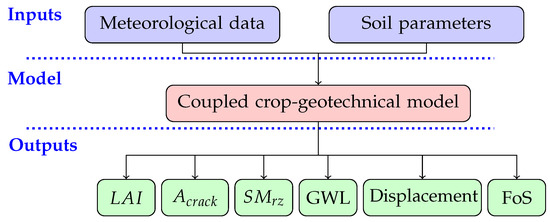 Commonly used geotechnical models (e.g., PLAXIS [44]) do not simulate the dynamic effects of vegetation on water flux (evaporation and influx) and therefore do not consider the influence that vegetation may have on land–atmosphere interactions and slope stability. Crop models, however, have been used to simulate the interaction of vegetation and the upper soil layers (e.g., LINGRA [45]). In recent research [36], the two models (LINGRA and PLAXIS) were coupled together to assess the effect of variable climatic and vegetation conditions on dike stability. As evaporation-induced cracks alter the water balance in a dike by increasing flow through the cracks and at the same time reducing the shear strength of the root zone, the model was further modified to include the effect of surface cracks [41]. Here, it is assumed that the cracks do not seal (close) in the wet periods, but only expand during unprecedented dry conditions. For example, if a crack is developed when root zone soil moisture () is 0.2 (cm water cm soil), it will expand when SM drops below 0.2. However, the crack area does not change if SM reverts above 0.2. The key inputs and outputs of the model are shown in Figure 1, where is the leaf area index, is the percentage of the crack area and GWL is the ground water level. The outputs are explained further in Section 3.1. In this paper, a 2D model of a vegetated dike is built using the integrated crop-geotechnical model and used to provide synthetic data.