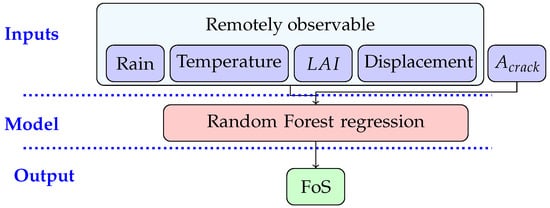 The synthetic data set, from the integrated crop-geotechnical model, is used to build and train an RF algorithm to predict the safety/stability condition (i.e., FoS) of the vegetated dike. The main idea here is to estimate the stability of the dike, without repeating expensive numerical simulations, using data that can be potentially observed without physical contact measurements. The general procedure for the ML model in this research is shown in Figure 2. The input features of the RF model include rain and temperature values obtained from the meteorological data, as well as and displacement, which are readily observable using remote sensing. The chosen parameters are also those with the highest impact on the target value, i.e., the FoS. For instance, rain and air temperature have a higher influence on FoS rather than other meteorological parameters used in the numerical study. In addition, the importance of as an input feature is investigated, as it is in theory observable from the dike surface, but there are no methods to do so yet available. The target (output) variables of the RF model are the FoS values predicted by the numerical model. The temporal resolution is 1 day for all of the features; , and are averaged over the surface. Displacement is retrieved for one location (one point) on the surface. The target value, FoS, is considered for the whole dike geometry.