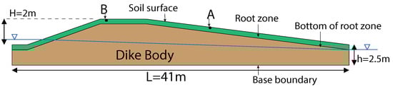 An example dike geometry is used in the numerical study which, to a large extent, resembles a regional (secondary) dike in Amsterdam, the Netherlands [2]. The same example dike is also used in [36,41,42]. This dike (Figure 4) has a relatively steep slope on the left-hand side and a gentle slope on the right-hand side and is permanently covered by grass. The dike body has the width of 41 m with a maximum height of 2 m. The dike is founded on a 2.5 m foundation layer of organic clay material, underlain by an impermeable material, represented as an impermeable boundary in Figure 4. The soil surface boundary and the left and right boundaries of the model dike are assumed to be permeable. The vegetation extends over the entire surface of the dike, and is assumed to have a fixed root depth of 40 cm, indicated in green in Figure 4. The dike is subjected to climate-driven forces acting on the surface, i.e., the precipitation, air temperature, wind and solar radiation.