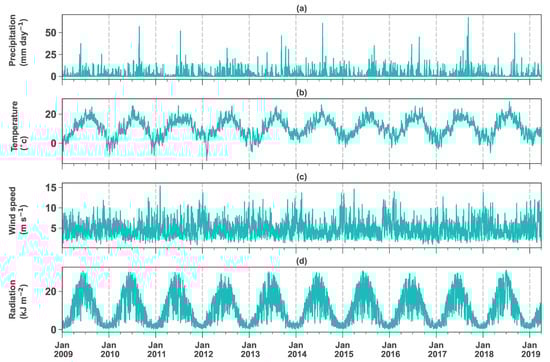 Daily values of inputs for the crop model from 2009 to 2019 (a) Precipitation; (b) Average temperature; (c) Average wind speed; (d) Radiation.