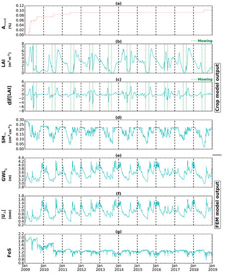The ground water level () measured relative to the base boundary at point A (see Figure 4) is shown in Figure 6e. During wet periods, the water level in the example dike increases, when the soil moisture in the root zone reaches the field capacity. As the spring starts and reduces, the typically decreases and reaches the minimum value in July 2018 when the has the lowest value during the studied period. Figure 6f shows the magnitude of the surface displacement at point A (), which follows a pattern similar to in Figure 6e. The seasonal cycle in is caused by variations in and ; in the winter period, the magnitude of displacement increases, while in the summer, it reduces. A slight accumulation of over time is seen due to plastic displacement and growing cracks due to shrinkage behaviour in the root zone. Finally, the temporal variation of FoS is shown in Figure 6g, which is the result of the combined effect of rainfall, change in and crack area variation from 2009–2019. The maximum crack area, and therefore the minimum shear strength parameter (cohesion and friction angle), lead to a minimum FoS in August 2018 when there is a heavy rainfall event and very low (almost bare soil), due to an extremely dry summer. The results show that the vegetation and dike condition are responsive to the climate condition and there is a similar temporal signature in all the plotted results.