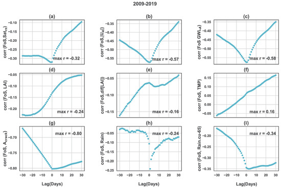 Lag correlation between FoS and (a) root zone saturation (); (b) magnitude of total displacement (); (c) ground water level at point A (); (d) ; (e) rate of change over 15 days (); (f) temperature (); (g) crack area (), (h) rain; (i) cumulative rainfall during the last 65 days.