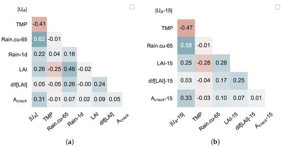A summary of the build RF regressor ability to predict the FoS is given in Table 6, for the training data set, testing data set (which are randomly selected over the years 2009–2017) and the evaluation data set (year 2018). In both scenarios (real-time assessment and short-term prediction), if the crack area is used as one of the features, the model performance improves both in the testing data set and in the evaluation data set. In short-term prediction, when the time window is shortened from 15 days to 5 days, the RF model performance improves, since there is a higher correlation between the features that have the highest impact (, and ) and FoS at the shorter lag. Currently, it is not feasible to measure the crack area, but there are ongoing studies to simulate the crack volume, e.g., [57].