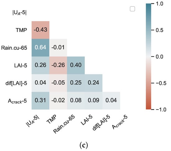 Correlation between features for (a) real-time assessment, (b,c) short-term prediction RF models with 15 days and 5 days lag, respectively.
