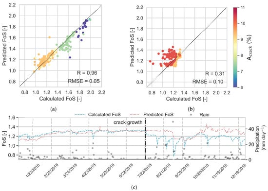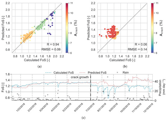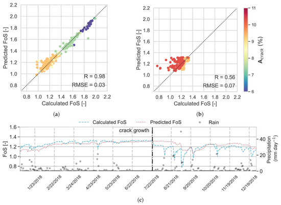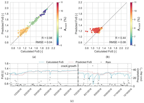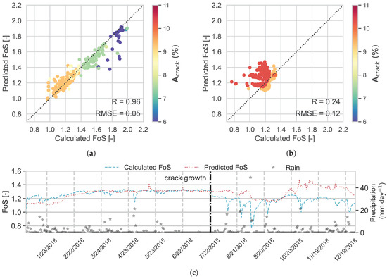 The results in Figure 12a, which are coloured by , show that for RF, R = 0.94 and RMSE = 0.06. The results for the evaluation data set (Figure 12b) show poor performance, i.e., R = 0.06 and RMSE = 0.14. As discussed before for RF, in the evaluation data set, after cracks grow, the red markers diverge from the diagonal line, showing the deviation of predicted FoS from calculated FoS after 22 July 2018. The markers that have the highest error in prediction correspond to heavy rainfall after crack expansion and cause reductions in calculated FoS, while RF cannot predict these values. In Figure 12b,c, the predicted FoS over 2018 is plotted against the calculated FoS in the independent data set. As before, it is seen that after the crack growth, the RF model cannot predict FoS accurately.