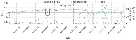 Figure 10a,b show the predicted FoS versus the numerically calculated FoS for the test set and the evaluation set, respectively. The points in these two plots are colourised based on . The coefficient of correlation (R) between the predicted and calculated FoS in the test data set is 0.94 and RMSE = 0.05. It is clear that the model performs well on the unseen data (test set) that is within its training sample space (Figure 10a). However, when it comes to the evaluation set, the model performance deteriorates (Figure 10b); R = 0.31 and RMSE = 0.1. The latter value is considered a high error, since the range of calculated FoS in 2018 is from (almost) 0.8 to 1.4 (although both the R and RMSE are affected by the lower range of values). The variation of predicted and calculated FoS in 2018 is shown by the left-hand side y-axis and the dashed and dotted lines, and precipitation in the same period is shown by the right-hand side y-axis and starts in Figure 10c. The low performance of the RF on the evaluation set can be explained based on the latter figure; until further crack growth takes place, the predicted FoS is very close to the calculated FoS (before 22 July 2018) (R = 0.82; RMSE = 0.04). This is also reflected on Figure 10b by orange markers close to the diagonal line. Once cracks start growing after 22 July 2018, the predicted FoS deviates from the calculated FoS (red markers on Figure 10b). This is particularly clear on the day with the heaviest precipitation in September 2018 (see Figure 10c), which causes a large drop in calculated FoS. The (red) markers with the highest distance from the diagonal line correspond to rainy days after crack growth in July 2018. The RF cannot capture the response to the heavy rainfall which occurs in this period.