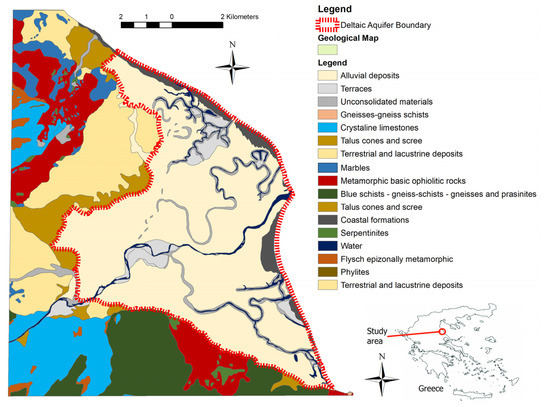 - Alexopoulos, J.; Matiatos, J.; Dilalos, S.; Vassilakis, E.; Panagopoulos, A.; Ghionis, G.; Poulos, S. Investigation of the Phreatic Aquifer Development at the Pinios Delta Basin (Thessaly), through a Combination of Geophysical and Hydrogeological Data. In Proceedings of the 10th Congress of the Hellenic Geographical Society, Mytilene, Greece, 22–24 October 2014; pp. 1130–1139. [Google Scholar]