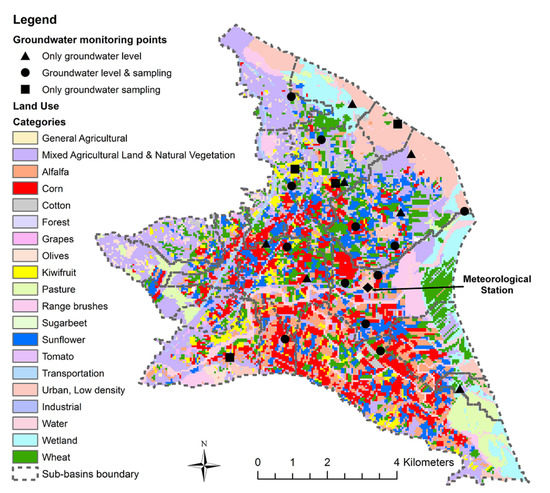 Land use map of PRDP. Groundwater monitoring network and SWAT model sub-basins are also illustrated.
