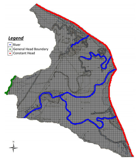 The model grid as well as boundary conditions assigned in PRDP phreatic aquifer are presented in Figure 3. The study area was discretized in 25,080 cells of 50 × 50 m size and the whole model grid area was 62.7 km2. SEAWAT was applied on the phreatic aquifer, the thickness of which varies between 5 and 15 m, while it was simulated as a single layer due to its small thickness and in order to reduce computational effort. The hydraulic interaction of the aquifer with the sea (eastern boundary) was simulated with Dirichlet (or first-type) boundary condition by implementing the Constant Head package of MODFLOW code. Head value was assumed to be 0 m above mean sea level (amsl), while chloride concentration was also kept constant at 21 g/L. The hydraulic communication of the aquifer with talus cones and screes at the west was simulated with Cauchy (or third-type) boundary condition by implementing the General Head package of MODFLOW code. Head values from neighboring wells were used to assign the relevant parameter, while the initially estimated conductance values, on the basis of the boundary geometry and the hydrogeological properties of the aquifer matrix and the bounding formations, were fine trimmed during calibration. The RIVER package of MODFLOW code (Cauchy boundary condition), was employed to account for the hydraulic interaction of the aquifer with the main hydrographic network. River stage and geometry were assigned based on measurements at several points, while river conductance was calibrated following the initially introduced estimates. Finally, capillary rise, as estimated by SWAT for each sub-basin, was introduced in the simulation using the evapotranspiration (ET) package of MODFLOW. Due to the fact that the pumping program and potential of each production well in the aquifer is not known, groundwater abstractions were also incorporated in the ET package at the sub-basin scale, calculated on the basis of irrigation demands resulted from SWAT. To this end, it was assumed that the totally used irrigation water is abstracted from groundwater at the areas where no surface water irrigation network occurs.