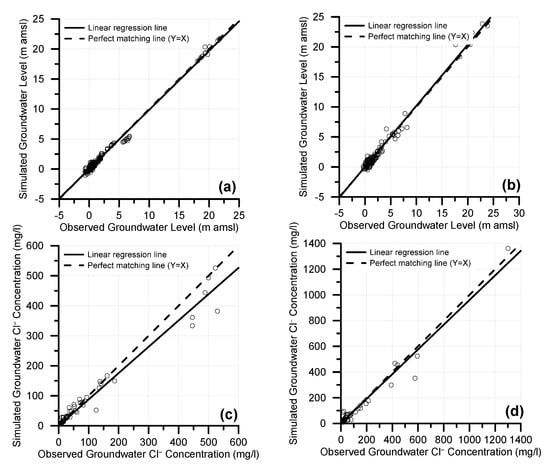 Scatter plots of observed versus simulated groundwater levels for calibration (a) and validation (b) periods. The corresponding plots for groundwater chloride concentrations are also presented for calibration (c) and validation (d).