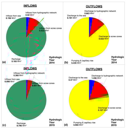 With regard to outflows from PRDP phreatic aquifer, the major outflow includes capillary rise and groundwater pumping, accounting for 5.435 Mm3 or 86% of the total outflows for year 2014, while the corresponding values for year 2015 are 5.965 Mm3 or 77%. The next most significant outflow was found to be groundwater discharge to the hydrographic network, which accounts for 0.663 Mm3 or 10% of total outflows for year 2014 and for 1.256 Mm3 or 16% of total outflows for year 2015. With regard to groundwater discharge to the sea, it was estimated for year 2014 at 0.191 Mm3 or 3.5% of total outflows, while the corresponding values for year 2015 were 0.37 Mm3 and 16%, respectively. Outflows to the scree cones were found to be negligible for year 2014 and less than 2% of total outflows for year 2015.