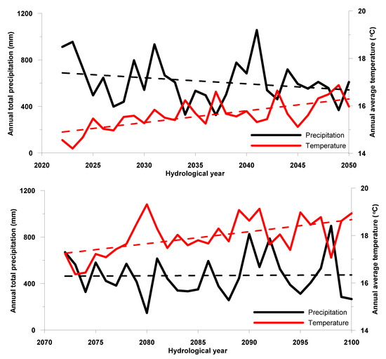 Time series of total annual precipitation (mm) and average annual temperature for the two projected periods, under the adopted RCM.