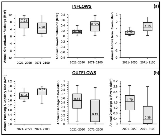 The annual variation of aquifer water budget elements for the two projected periods is presented in the box-plots of Figure 7. With regard to inflows, median direct groundwater recharge for the period 2021–2050 is estimated at 7.93 Mm3/year, while the corresponding estimated value for the period 2071–2100 is almost half (4.2 Mm3/year). The minimum and maximum annual groundwater recharge values for the two projected periods are almost equal, likewise the extent of the interquartile range. Nevertheless, it is interesting to mention that the upper bound of the interquartile range for the period 2071–2100 is close to the median of the period 2021–2050; This in turn, indicates considerable variability of annual groundwater recharge, which in absolute values is significantly lower during the period 2071–2100, compared to 2021–2050. Annual median seawater inflows for the period 2021–2050 is estimated at 0.14 Mm3/year while for the period 2071–2100 it is more than triple (0.385 Mm3/year). Moreover, interquartile ranges of the two projected period almost do not coincide, thus indicating significantly different temporal variation pattern of seawater intrusion for the two periods. A similar variation pattern is also presented for the inflows from the hydrographic network, according to which median annual values for the period 2071–2100 is almost triple compared to those of the period 2021–2050 (Figure 7a), while interquartile ranges of the two projected periods almost do not coincide.
