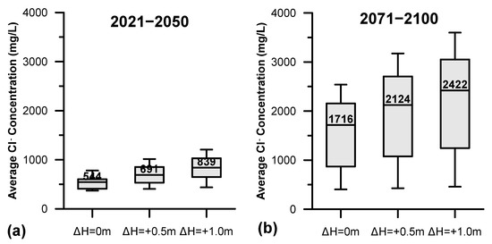 Boxplots presenting the annual variation of groundwater Cl− concentration for the periods (a) 2021–2050 and (b) 2071–2100 under no sea level rise (ΔH0), sea level rise of 0.5 m (ΔH0.5) and sea level rise of 1 m (ΔH1).