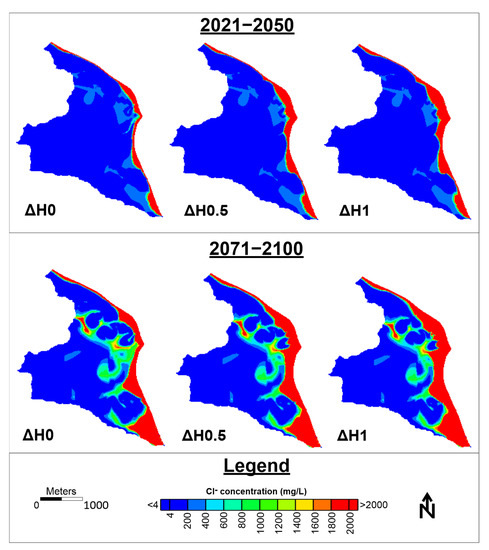 Spatial distribution of groundwater Cl− concentration at the end of periods 2021–2050 and 2071–2100 for no sea level rise (ΔH0), sea level rise of 0.5 m (ΔH0.5) and sea level rise of 1 m (ΔH1).