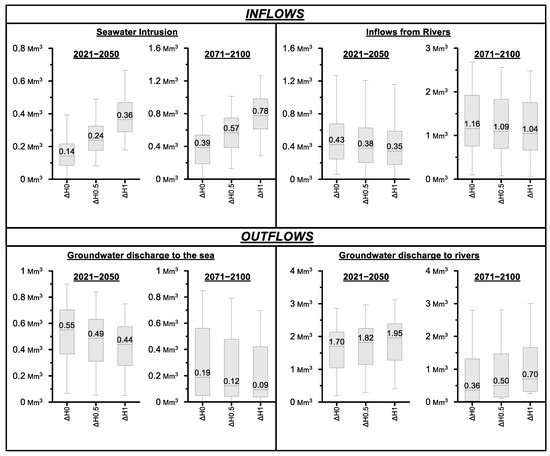 The simulated effects of sea level rise by 0.5 m (ΔH0.5) and 1 m (ΔH1) on critical groundwater budget elements for the two projected periods are presented in Figure 10. The effects of sea level rise in seawater intrusion was found to be significant, since seawater intrusion volume was found to be on the median increased by 0.1 Mm3/year (or 71%) under ΔH0.5 scenario and by 0.24 Mm3/year (or 157%) under the ΔH1 scenario for the period 2021–2050. Significant increase in seawater intrusion volume was also simulated for the period 2071–2100, since seawater intrusion volume was found to be on the median increased by 0.18 Mm3/year (or 57%) under ΔH0.5 scenario and by 0.39 Mm3/year (or 100%) under the “ΔH1” scenario. Inflows from rivers indicated decrease trend for both projected periods. More specifically, they were found to be on the median decreased by 0.05 Mm3/year (or 11.6%) under ΔH0.5 scenario and by 0.08 Mm3/year (or 18.6%) under the ΔH1 scenario for the period 2021–2050, compared to no sea level rise (ΔH0). The corresponding decreases for the period 2071–2100 were 0.07 Mm3/year (or 6.0%) under ΔH0.5 scenario and by 0.12 Mm3/year (or 10.4%) under the ΔH1 scenarios.