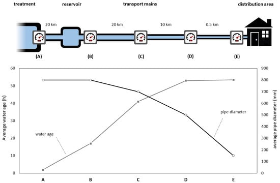 Characteristics of sampling points in the studied DWDS. (Top) Schematic overview of transport mains and distribution system piping layout, indicating the sampling point locations (A–E). (Bottom) Change in average water age and pipe diameters over the studied water trajectory from sampling locations A to E.