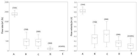 Changes in the flow rates (left) and flow velocities (right) from the treatment effluent (A) and four locations over the water transport (B–D) and distribution (E) trajectory. Box plots show the first, second (median), and third quartiles, whiskers show the data range, circles show outlier values, and a cross (x) indicates the mean value. The number of measurements are shown in brackets.