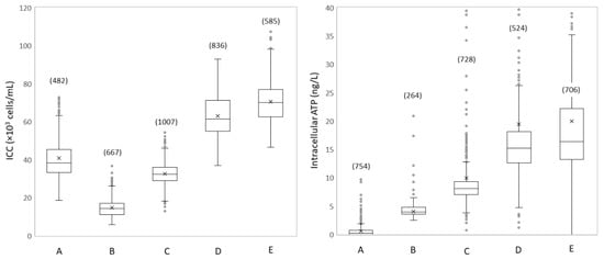 Range of FCM intact cell concentrations (left; ICC) and intracellular ATP concentrations (right) at the treatment effluent (A) and four locations over water transport (B–D) and distribution (E) trajectory. Box plots show the first, second (median), and third quartiles, whiskers show the data range, circles show outlier values, and a cross (x) indicates the mean value. The number of measurements are shown between brackets. For ATP data, outliers for locations C (9 outliers), D (18 outliers), and E (26 outliers) up to 700 ng/L are out of scale.