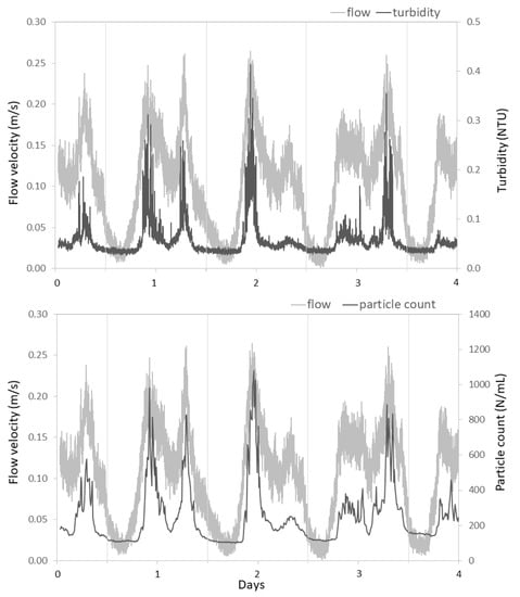 Variations over four days of flow velocity compared to turbidity (top figure) and the number of particles of 1 to 2 µm size (bottom figure) at distribution location E. For comparison purposes, the flow velocity data shown on the top and bottom figures are identical. Flow velocity and turbidity data are presented as moving averages. Vertical lines indicate the time at 0:00 of each day.