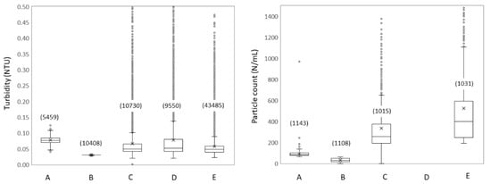 Range of turbidity (left) and total particle counts (right) at the treatment effluent (A) and four locations over water transport (B–D) and distribution (E) trajectory. Particle counts data from location D are not reported due to instrument failure. Box plots show the first, second (median), and third quartiles, whiskers show the data range, circles show outlier values, and a cross (x) indicates the mean value. The numbers of measurements are shown in brackets. Outliers for locations C (26 outliers for turbidity and 9 for particle counts), D (15 outliers for turbidity), and E (48 outliers for particle counts) up to 0.9 NTU and 2600 particles/mL are out of scale.