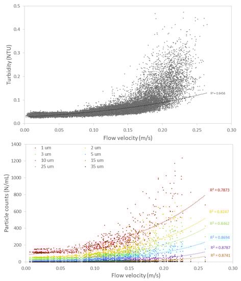 - Flow velocity variations have a strong impact on turbidity and particle counts as a result of particle deposition and re-suspension.