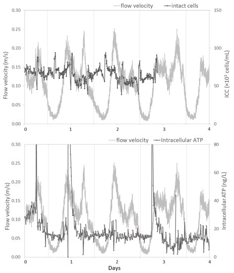 Variations over four days of flow velocity compared to FCM intact cells (ICC, top figure) and intracellular ATP (bottom figure) at distribution location E. For comparison purposes, the flow velocity data shown on the top and bottom figure is identical. Flow velocity data is presented as moving averages. Vertical lines indicate the time at 0:00 of each day. Eight ATP data points up to 450 ng/L are out of scale.