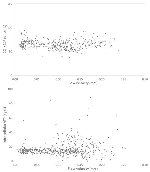 Relation between flow velocity and FCM intact cells (ICC, top figure) and intracellular ATP (bottom figure) at distribution location E.