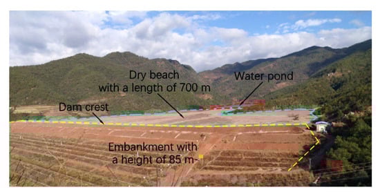 Currently, China has more than 12,000 tailings ponds, of which approximately 95% are constructed using upstream methods [11]. In this method, tailings slurry, a mixture of solid tailings and tail water, is discharged into a reservoir from the crest of the dam, which forms a deposited beach with a certain slope under the action of gravity. The part of the deposited beach near the crest of the dam is called the dry beach, which is not covered by tail water and becomes the foundation of the embankment in the next stage. Figure 1 depicts a photograph of a tailings pond in southwest China that shows the different positions, such as the embankment, dry beach, water pond, and dam crest, of a tailing dam.