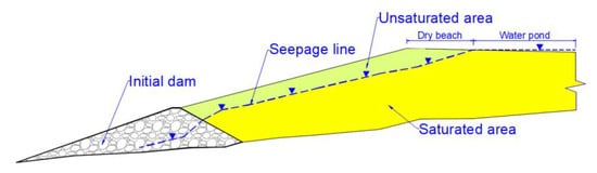 Figure 2 shows a schematic of an upstream tailings dam structure. The accumulated tailings are divided into unsaturated and saturated portions via the seepage line inside the tailings dam. The mechanical parameters of rock and soil are related to the moisture content (degree of saturation) [12]. The presence of water in the pores and fissures inside the rock and soil weakens their strength. Several landslides and dam collapse accidents are related to pore water. The investigations show that in a tailings dam constructed using the upstream method, the unsaturated tailings above the seepage line account for approximately 10% of the total accumulated tailings, with a high degree of saturation, which generally exceeds 50% [13,14,15]. Moreover, after the tailings pond becomes inactive, the unsaturated zone in the tailings pond is generally expanded further. The high degree of saturation in the unsaturated zone of a tailings dam is mainly caused by the continuous addition of water from the slurry discharge, as well as capillary rise and rainfall [13]. This significantly affects the stability of the tailings dam [16,17], particularly during earthquakes and vibrations caused by mining activities [18]. For example, the reduction in the strength of tailings in unsaturated zones due to improper pore water management and high and intense regional wet season rainfall is a primary reason for the Feijão tailings dam disaster in 2019 [19]. Therefore, it is critical to study the influence of moisture content on the mechanical properties of unsaturated tailings.