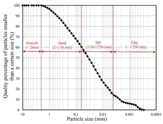 As shown in Figure 3, the test tailings were the latest produced tailings collected from the discharge pipe of the Huangcaoping tailings pond that belongs to Pingchuan Iron Co., Ltd., Sichuan Province, China. The tailings particle size distribution, shown in Figure 4, was determined using a S3500 light-scattering particle size analyzer (manufactured by Microtrac, Inc., Montgomeryville, PA, USA). The parameters of particle size distribution characteristic and certain other physical properties are listed in Table 1. The test tailings can be classified as tailings silt according to the China National Standard GB50863 [41] and sandy silty clay according to the American Society of Testing Materials Standard D2487 [42].