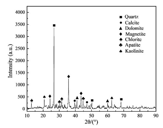 The mineralogical composition of the tailings was analyzed by the Smartlab X-ray diffractometer (XRD) (manufactured by Rigaku Corporation, Tokyo, Japan). The results are shown in Figure 5. The primary minerals in the tailings were quartz, calcite, dolomite, magnetite, chlorite, apatite, and kaolinite.