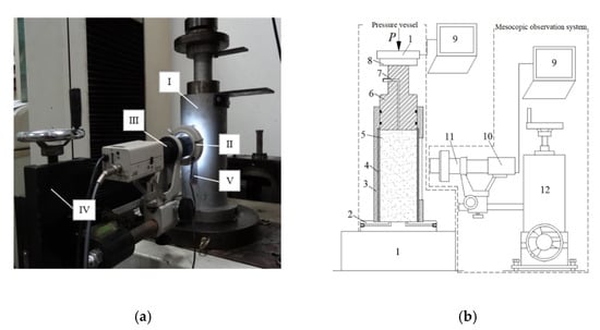 The test equipment is a testing apparatus, developed by us, to observe the mesomechanics and deformation of tailings, as shown in Figure 6a. It is mainly composed of a loading test machine, pressure chamber and accessories, as well as a mesoscopic observation system. Figure 6b shows a schematic of the device structure. Its composition structure and technical parameters are described in detail in [36,37]. This study employs a confined compression test under continuous load, and the loading equipment is an AG–250kNI material testing machine (manufactured by Shimadzu Corporation, Kyoto, Japan).