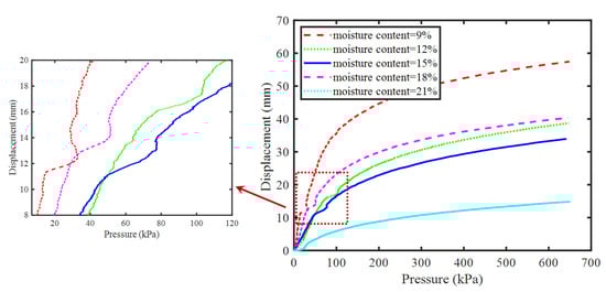 As shown in Figure 7, the behavior of the pressure−displacement curve of the specimen with a moisture content of 21% is different from those of the other four specimens. In this curve, there is almost no first stage as described in the aforementioned analysis. The degree of saturation of this specimen was very high, at 99.4%. The specimen attained saturation rapidly under load, and pore water seeping was observed from the exhaust hole of the pressure chamber during the test. Due to the poor permeability of the tailings, the pore water cannot be discharged in time, which leads to the formation of excess pore water pressure. This further reduces the deformation rate and final deformation of the specimen. However, it is possible to clearly observe the particle rearrangement stage where small particles squeeze into the large pores.