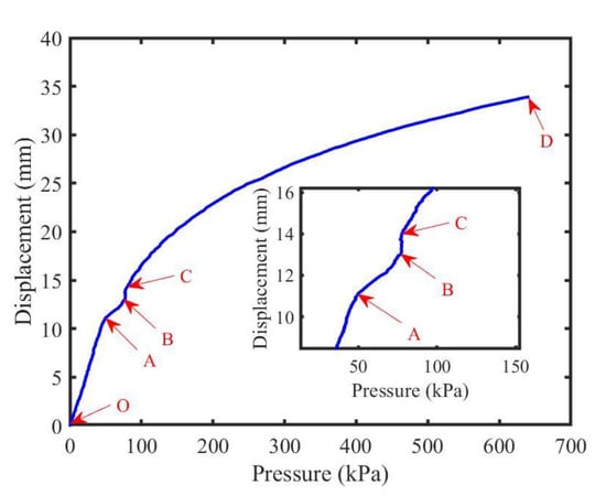 Pressure−displacement curve of tailings specimen with 15% moisture content under continuous load. Points O, A, B, C, and D are the end points or critical points of the curve.
