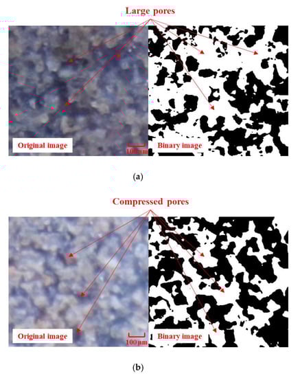 During the continuous loading process, changes in the particle mesostructure of the tailings specimen were observed in real time using a stereo microscope and CCD camera; the mesostructure images at different moments were captured. Considering the sample with a moisture content of 15%, the original and binary images of the mesostructure of the tailings particles at different times are shown in Figure 10. The binary images, where the black represents particles and white represents pores, were obtained using the CF2000P polarized light analysis program (manufactured by Shanghai Changfang Optical Instrument Co. Ltd., Shanghai, China). Due to certain unfavorable factors, such as the pore water adhering to the inner wall of the observation window, the movement of particles scratching the observation window, and observation window with a certain curvature instead of a plane, the mesostructure image clarity was reduced.