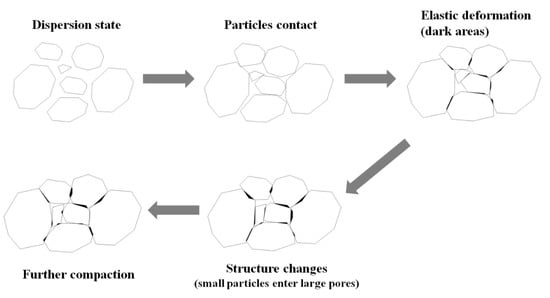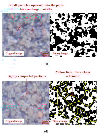 The evolution of the particle structure changes the contact force transfer net, viz., the force chain, in the particle system [32,43]. As shown in Figure 10a, when no load is applied, the tailings particle structure presents a loosely dispersed state, the particles are disorderly arranged, and large pores between the particles are clearly visible. As the load increases, the pores are easily compressed, and the connection between the particles tightens, as shown in Figure 10b. The process from the dispersed state of the particles in Figure 10a to the compact state of the particles in Figure 10b corresponds to the OA segment in the pressure−displacement curve in Figure 8. Here, a weak force chain is formed between the particles. With a further increase in the load, there is almost no change in the relative position between the closely connected particles observed in the microscope; however, the macroscopic settlement deformation of the specimen continues to increase, but this increment is small. This shows that a certain amount of elastic deformation may occur at the interconnected parts of the particles, which accumulates to form a macroscopic deformation. This process corresponds to the AB segment of the curve in Figure 8. The force chain between the particles becomes stable and strong. As shown in Figure 10c, when the load increases to a certain extent, the original arrangement and structure of the particles are destroyed, and small particles are squeezed into the pores between large particles, thus reducing the pores between the particles and corresponding BC segment of the pressure−displacement curve. This process generally occurs in binary granular mixtures with large size ratios during volume compression [44,45]. The experimental tailings in this study have a large particle size distribution range with a uniform coefficient of approximately 26, which is a favorable condition for this process. Here, the original force chain between the particles is broken, and the new force chain is not formed. Hence, the load shows less change or may slightly decrease with an increase in the displacement. Then, as the load increases further, the particles are more closely connected, and a more compact structure of the particles is generated, where an extremely stable force chain net is formed, as shown in Figure 10d. Thus, the changes in the mesostructure of the tailings particles can be graphically represented as shown in Figure 11, which are obtained by summarizing the results shown in Figure 8 and Figure 10. The four stages (four thick arrows) shown in Figure 11 correspond to the four stages of the pressure−displacement curve in Figure 8.
