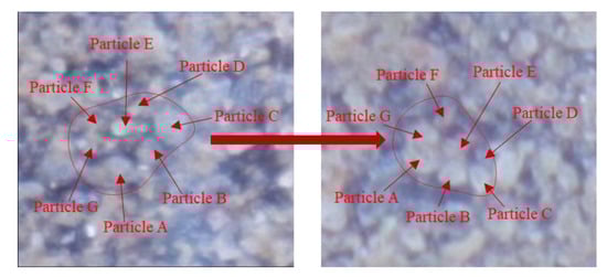 For the specimens with moisture contents of 12%, 15%, and 18%, as the moisture content increased, the degree of saturation of the tailings and proportion of the pores filled with water increased, and the liquid bridge regime gradually changed from funicular to capillary, respectively. Under this condition, the liquid bridge has a strong adhesive force, which can allow several adjacent particles to form a block [50]. Microscopic observation showed that under the action of pressure, the movement of individual particles and overall movement of blocks could be observed. As shown in Figure 13, a block has been translated and rotated integrally, but the relative position of the particles inside the block did not change; however, the structure of the block became compact. A similar phenomenon was observed in the DEM numerical simulation for granular materials, which was conducted by Zdenek Grof et al. [51,52].