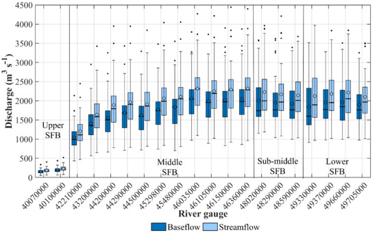 Figure 3 shows the distribution of annual streamflow and baseflow for river gauges over the SFB. The median () and the upper and lower bounds of the interquartile range () of (25th 75th percentile) increased moving downstream from the Upper SFB (= 195 m3 s−1; 154 241 m3 s−1), to the Middle SFB (= 1907 m3 s−1; 1505 2378 m3 s−1), to the Sub-middle SFB ( = 1997 m3 s−1; 1745 2485 m3 s−1) (Figure 3). On the other hand, we observed a slight decrease in both the 25th percentile of and from the Sub-middle to the Lower SFB ( = 1920 m3 s−1; 1677 2535 m3 s−1).